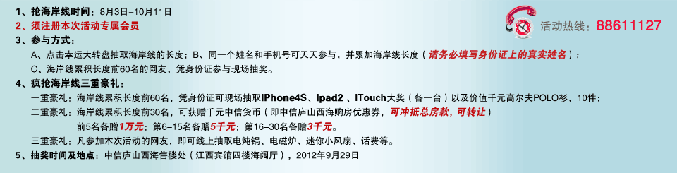 | 中信庐山西海项目位处江西九江的庐山西海国家风景名胜区,素有中国“桃花源”发祥地之说。启动区总占地7平方公里,占据最美湖岸线景观,坐拥“7湾、8岛、1湖、1山”罕世资源,规划分为养生度假区、生态乐活区、会务康体区以及运动休闲区四大主题,重点打造“2个公园、3个基地、5个主题酒店”,以“身心修养”为核心价值,构建“身心学禅”四大价值体系,通过对区内生态契约、休闲养生、商务会议、绅士运动、教育培训、禅修太极等一系列特色主题的精心设计,使得国内外客户在体验极致生态社区的同时,得以享受一站式度假服务和圈层平台。 [详细 |